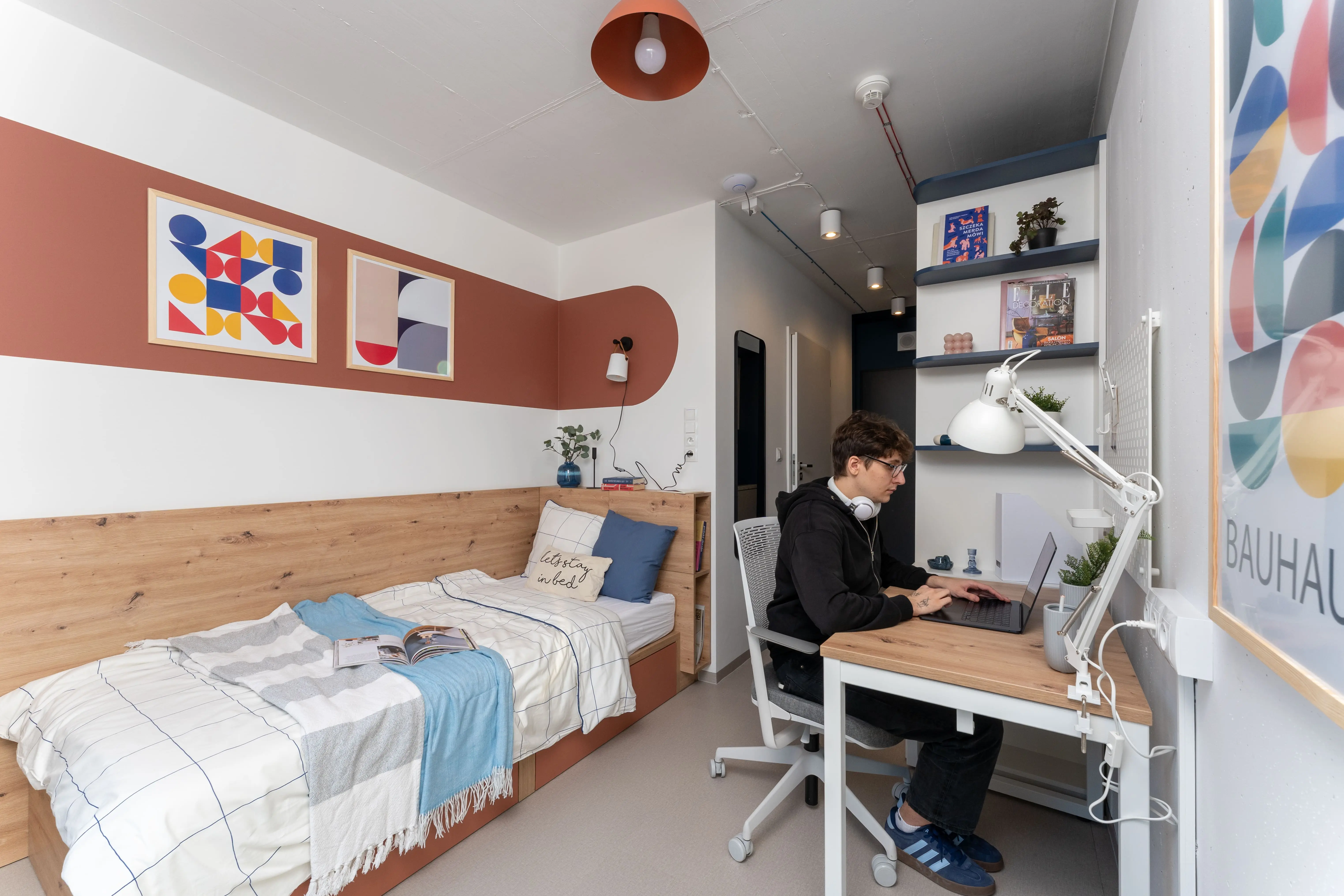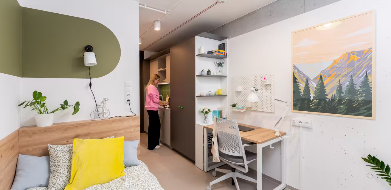 Nasze apartamenty zostały zaprojektowane z myślą o studentach i studentkach. W każdym pokoju znajdziesz wygodne łóżko, prywatną łazienkę z prysznicem, aneks kuchenny z płytą indukcyjną i lodówką oraz biurko z ergonomicznym krzesłem i pojemną szafę. Nasze jasne i nowoczesne wnętrza są idealne i do nauki, i do relaksu.